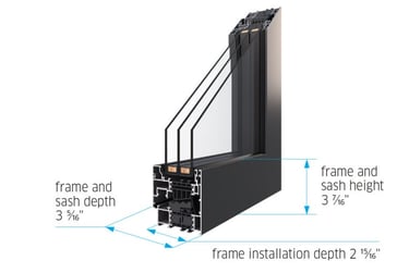 Frame and sash depth: 3 5⁄16″, installation depth: 2 15⁄16″. The 3 ¾” total height provides a clean and minimal frame reveal.