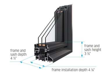 Frame and sash depth: 4 ½”, with installation depth of 4 ⅛”. Profile height of 3 ¼” delivers a bold, industrial look with robust performance.